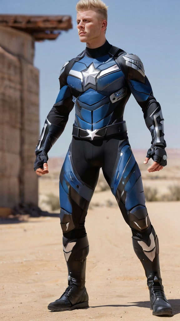 Sci-Fi futuristic tech meets the American soldier. Hypermasculine Caucasian male, tall, strong, muscular, sinewy, broad chest and back, narrow waist, big arms and powerful legs. Bodybuilder. Sandy-blonde hair, faux-hawk close on the sides and spiky on top. Strong brow and jaw, handsome face, blue-grey eyes usually covered by sapphire blue solar shields/goggles. Blonde chevron mustache on his face. Air Force blue spandex outfit; long sleeved mesh shirt with white cut-out star on the chest. Silver shield-shaped shoulder pads with black trim on shoulders, metallic power/energy gloves with the same style. Spandex pants stretched over muscular legs and a bulging groin, white stripes and stars down the sides of his thighs. Metallic black knee-high boots with same white stripes and stars across the tops. He carries a round holographic energy shield that can expand to protect him and others. A futuristic jetpack in blue, silver and black strapped across his back to help him fly. Full body pose, him flying through the skies.