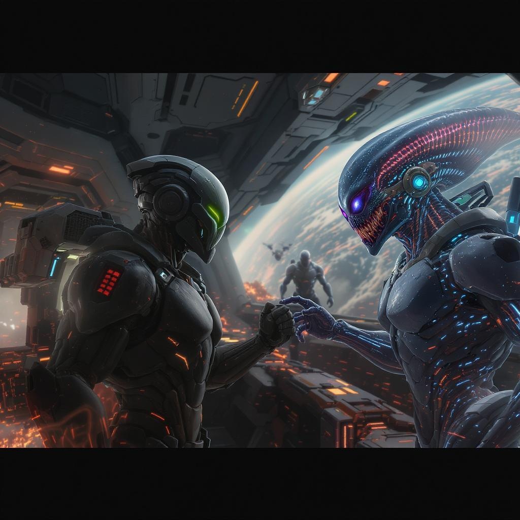 Sci-Fi hyper-realistic scene with intricate details and cinematic lighting, capturing a dramatic moment in sharp focus with a strong depth of field, resembling an IMAX experience in UHD, HDR, 8K resolution. The setting features advanced futuristic technology and architecture, showcasing a vivid display of human and alien characters engaged in a tense, dramatic interaction. The environment is bustling with dynamic elements, yet maintains clarity and precision without distractions or imperfections. Characters are perfectly modeled, with distinct and expressive features, free from any deformities or irregular traits, set against a seamless, immersive background that draws viewers into the heart of this speculative world. The composition is flawless, ensuring no out-of-frame elements, blurriness, or artificial artifacts disrupt the viewer’s experience, while reinforcing a sense of awe and wonder inherent in high-quality sci-fi storytelling.