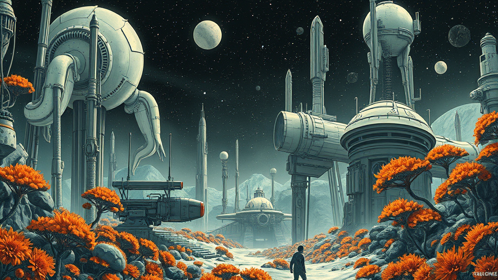 Sci-fi illustration inspired by Roblunda McCallum, featuring blink-and-you-miss-it details, showcasing a full-body scene in hues of dark white and light orange. Emphasizing sci-fi realism with a nod to pulp comics, the artwork combines airbrush and comic art techniques. The setting is a futuristic landscape with intricate machinery and alien flora that captivate the eye, bathed in a contrasting light that highlights the depth and texture of the scene.