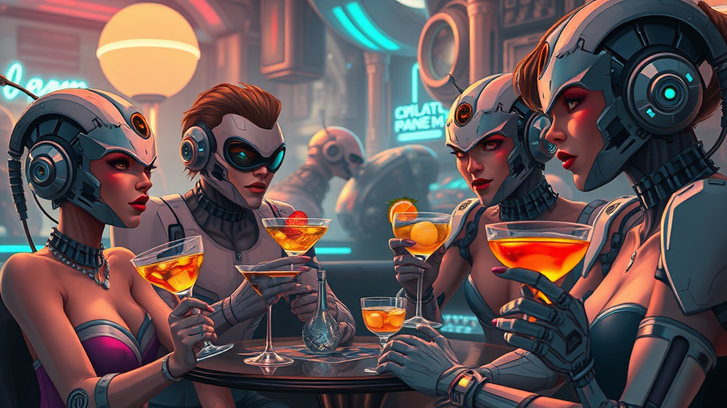 Sci-fi individuals sipping exotic cocktails in a futuristic bar, enveloped by intricate and detailed robotic cyborgs with advanced mechanical designs, featuring a hyper-realistic and cinematic atmosphere. The composition draws inspiration from Federico Pelat and Jan Urschel's styles, with an ArtStation HQ quality. The scene combines elements of drawing, painting, and cel-shading, with characters wearing vibrant makeup and bold lipstick. The ambiance is vibrant and dynamic, with a fusion of technology and human interaction in a richly detailed environment.