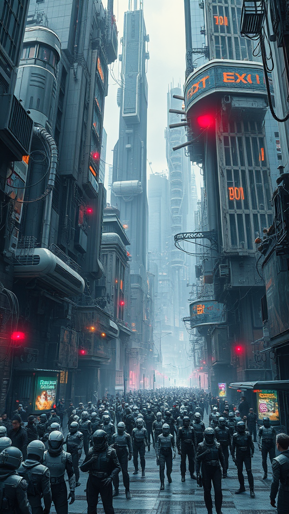 Sci-fi inhabitants gathered amidst a sprawling futuristic cyborg metropolis, featuring towering robotic structures and intricate mechanical and cybernetic details, with an insane level of detail capturing every nuance; hyper-realistic and cinematic in its presentation, offering a dynamic composition highlighted by striking high contrast elements, with subtle creative touches enhancing the otherworldly atmosphere.