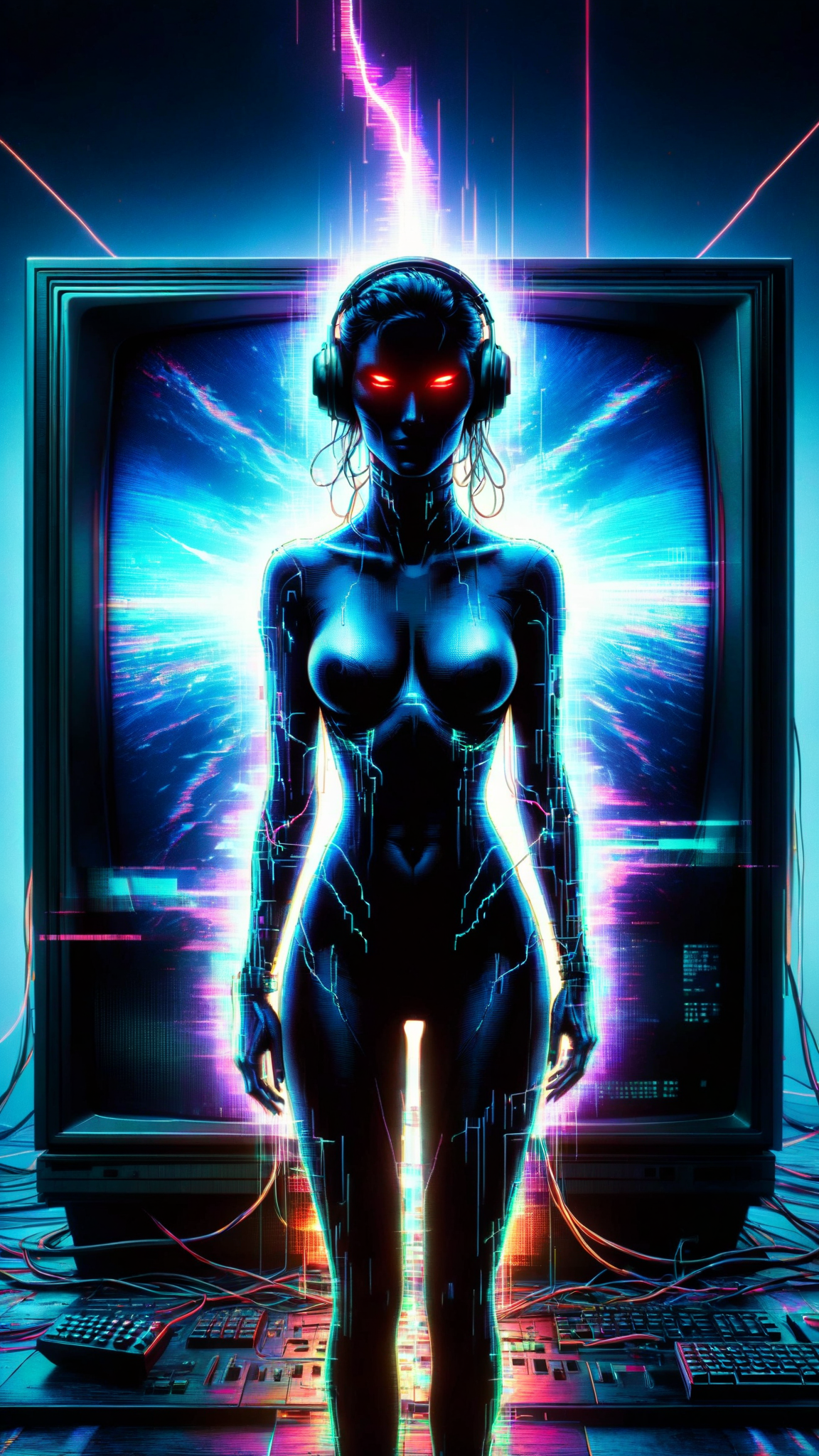Sci-Fi, strange, eerie. Ghost in the electronics? She is a female SILHOUETTE with TV static inside, but no discernable features--- SHE HAS NO FACE, nothing such as eyes or lips, her visage is a blank slate. (((She is an outline with static inside))) She is composed completely of television static/energy and has an eerie glow. She IS energy and can move through power lines, telephone lines, outlets, cable lines, and anything plugged in. She can appear in television screens, computer monitor screens, and sometimes smartphone screens. She travels through connected lines, but can ride the airwaves if necessary. When she appears in full humanoid form, she is just a glowing figure composed of television static. She has no actual voice, but sometimes people can hear breathing through whatever electronic devices they might be using. Otherwise, she sounds like the white noise that television static makes. She seems to have a tendency to appear to attractive men, though anyone can see her if she chooses to make herself visible. No one knows where she came from or what she wants; it is believed she came into existence with the creation of the first electronic device, mainly television. She is not known to be dangerous, but people that have seen her get an uneasy feeling, but something with NO FACE has that tendency. She tends to appear whenever people (especially men) fall asleep in front of the TV late at night.....