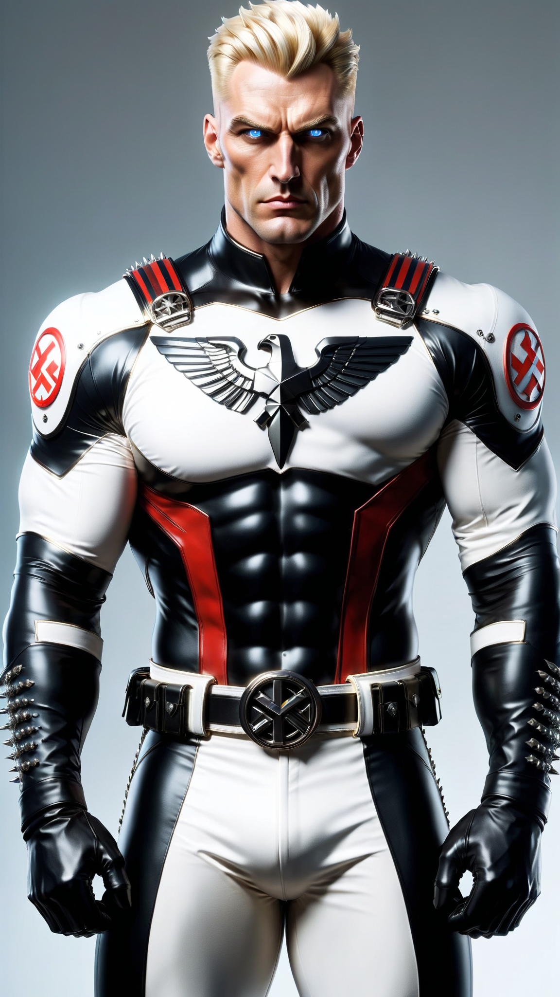 Sci-Fi, tech. Supervillain. Super-soldier, member of the Neo-Nazi party, created by a German mad scientist. He wears a jetpack on his back to fly, and tech powergloves capable of creating lightning as a weapon. He is also invulnerable to many physical attacks. Caucasian male of German descent. Tall, muscular, big muscled, bodybuilder. Pale blond flat top hairstyle, shaved close on sides and spiky on top. Handsome face, strong brow and jaw. Clean shaven, no facial hair. Icy blue eyes, intense stare--NEVER SMILES. Completely white spandex uniform; long sleeved spandex shirt with huge Nazi swastika in black on the front, red stripes down the sides of the arms. Black metallic shoulder pads, black tactical belt. White spandex pants with red stripes down the sides. Black leather knee-high boots, ceremonial corps boits. Full body pose, he wears his swastika proudly with no shame.