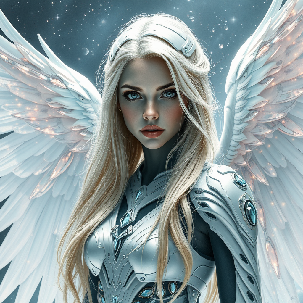 Sci professional artwork, ultra-fine 3D details, full body archangel wings extended upward, hyper-realistic intricately designed in pure white, sci-fi realism, airbrush art. A captivatingly realistic 3D alcohol ink double exposure illustration, featuring a full-length portrait of a beautiful futuristic woman, with flowing silver-blonde hair and deep gray eyes. Her skin shows black parts merged with human skin, surrounded by intricate details against a long exposure celestial backdrop that fuses together in a delicately blended double exposure effect. The interplay of colors and iridescent patterns creates a mesmerizing optical illusion, featuring a turquoise angelic female figure with flowing golden hair and elegant feathery wings. Her futuristic gem-adorned armor and long, flowing tresses blend seamlessly with the ethereal surroundings. The overall atmosphere exudes an air of fantasy and wonder, making the piece a masterful work of art.