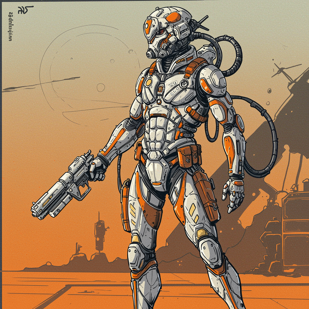 scifi artwork by roblunda mccallum influenced by intricate blink-and-you-miss-it detail, featuring a full body design in shades of dark white and light orange, blending sci-fi realism with a pulp comics vibe, reminiscent of classic airbrush techniques and comic art, showcasing a futuristic scene with high stylization, exhibiting a meticulous composition within an elongated format