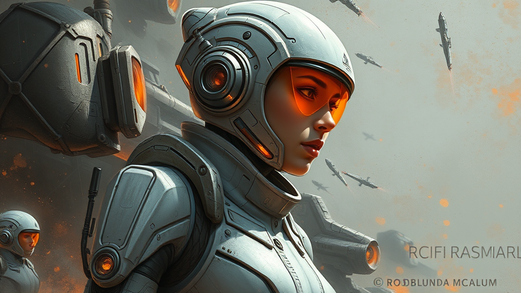 Scifi artwork inspired by Roblunda McCallum, featuring intricate, blink-and-you-miss-it detail, showcasing a full-body figure in shades of dark white and light orange, blending sci-fi realism with a pulp comic aesthetic. The piece reflects airbrush artistry and comic art style, capturing the essence of futuristic storytelling with subtle nuances and high stylization.
