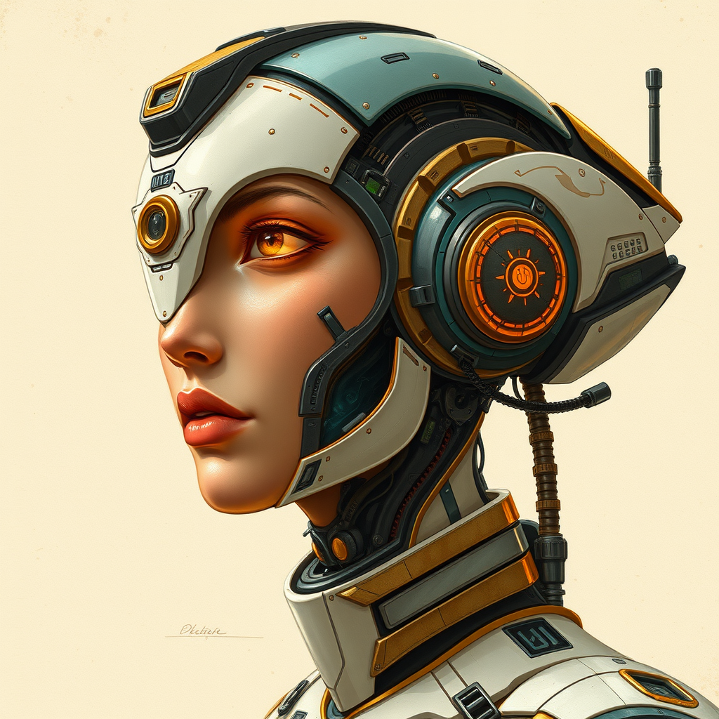scifi fantasy illustration elegant android, in the style of intricately detailed portraits, deep ivory and tangerine, classic portraiture, rich bronze and teal, realism with precise detail, defined contours, futuristic innovations