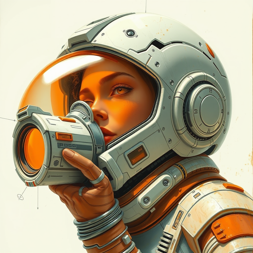 scifi illustration inspired by roblunda mccallum, featuring intricate blink-and-you-miss-it details, complete figure, with a palette of muted white and vibrant orange, exploring sci-fi realism infused with pulp comic aesthetics, smooth airbrush techniques, and dynamic comic art influences
