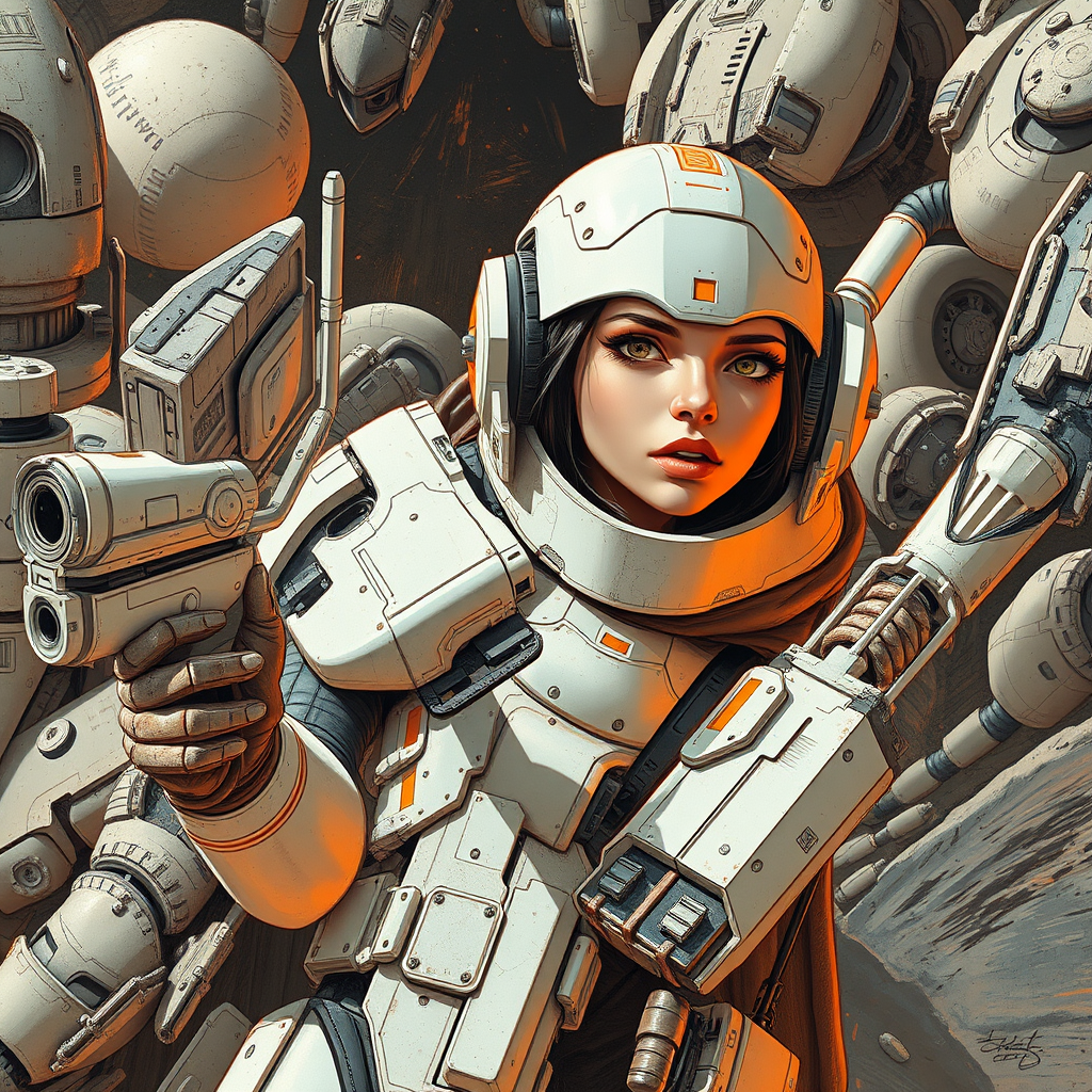 scifi illustration inspired by roblunda mccallum, featuring intricate details that catch the eye upon closer inspection, full body depiction with a palette of dark white and soft orange hues, blending sci-fi realism with the essence of classic pulp comics, using smooth airbrush techniques and comic art elements --aspect ratio 31:64 --high stylization at 750 --version 6