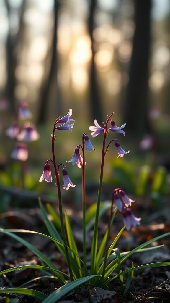 Scilla flowers blooming in the spring forest at dawn, subtle color grading, gentle shadows, low contrast, crisp sharp focus, soft bokeh background, fresh spring atmosphere, ultra-realistic photography, ethereal morning light, vertical composition.
