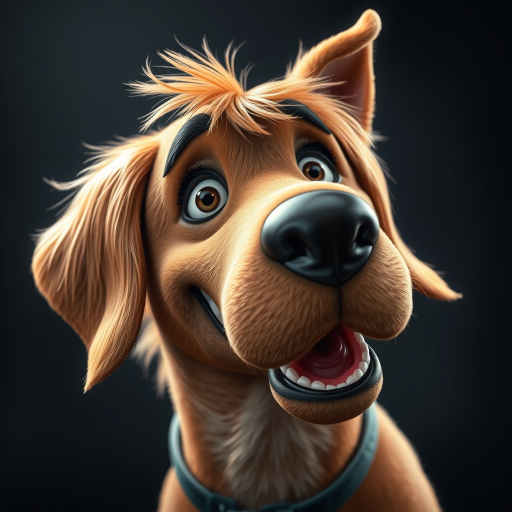 Scooby Doo inspired portrait, featuring a light brown-haired dog with a playful expression, rendered in sharp focus as digital art. The composition focuses on a single subject with concept art influences, showcasing dynamic lighting and ultra-detailed textures. Subtle creative modifications highlight Scooby Doo's iconic characteristics, bringing an imaginative touch to the portrayal.