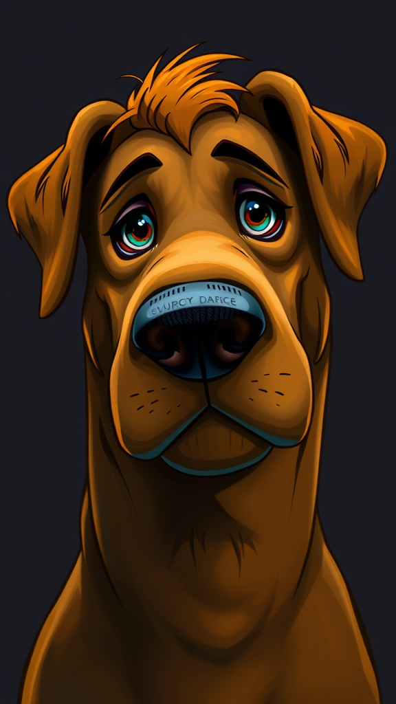 Scooby Doo, portrait, canine character, rich caramel fur, crisp focus, digital illustration, solitary figure, imaginative design, refined in post-production, vibrant illumination, highly intricate, essence of Scooby Doo.