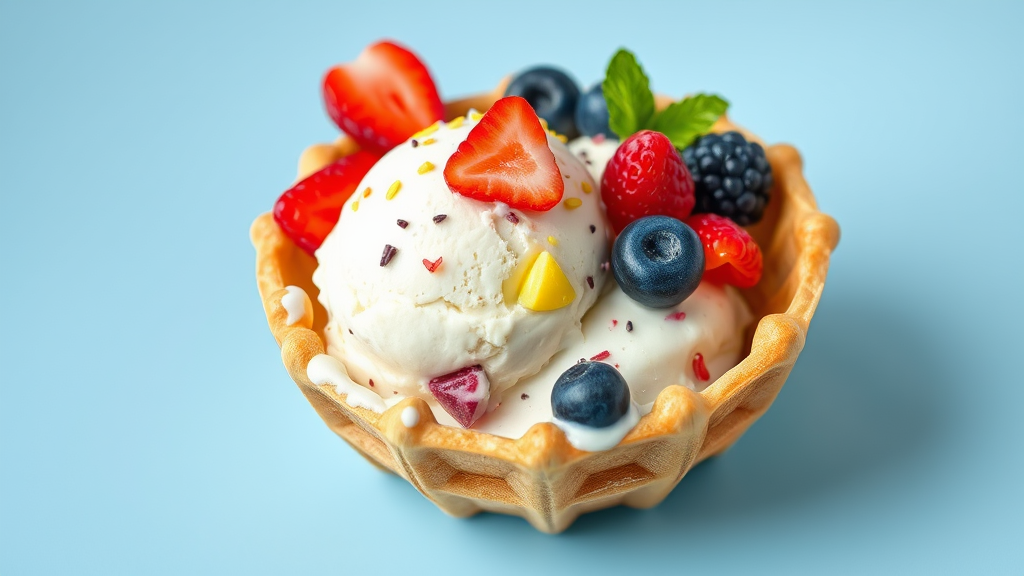 Scoop of delectable ice cream nestled in a crisp waffle bowl shaped like a half globe, adorned with colorful fresh berries and a sprinkle of delightful toppings.