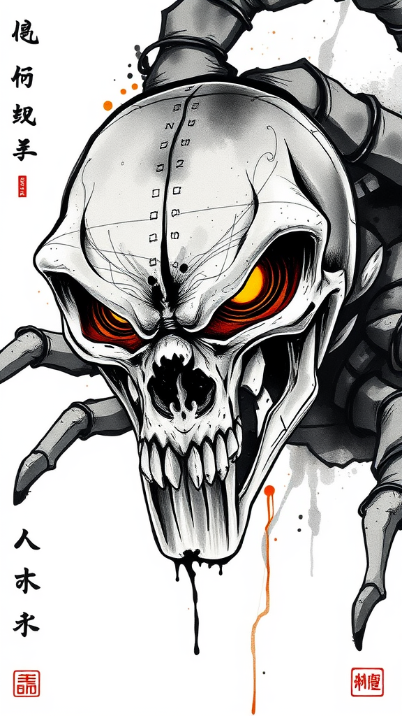 Scorpion from Mortal Kombat, featuring a menacing skull face and warm, dull lifeless eyes, depicted as an intensely frightening character. The close-up composition is infused with ink artistic techniques and subtle typography elements, set in an abstract design. The palette employs complementary colors, with a mosaic of characters offering a visual texture. The style is reminiscent of a wallpaper, blending simplicity with the elegance of Chinese painting, all set against a stark white background.