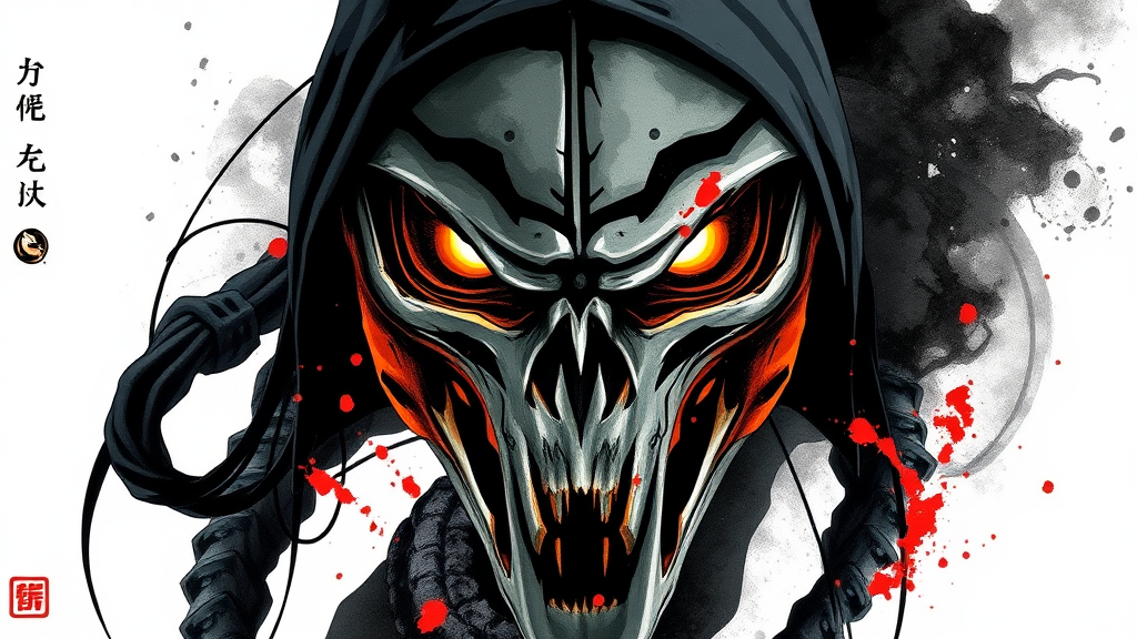 Scorpion from Mortal Kombat, with a haunting skull visage, eerie warm white eyes devoid of life, an intensely terrifying presence portrayed in close-up, rendered with an ink-inspired artistic style. Complementary colors form a mosaic of abstract typography elements, creating a striking wallpaper aesthetic. The simplicity and elegance of Chinese painting techniques on a white background enhance the character's fearsome allure with subtle creative nuances.