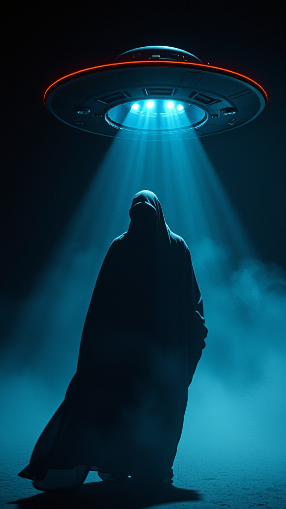 Screengrab from a 1988 sci-fi film, rich 35mm film texture, live-action scene featuring a mysterious futuristic ghost shadowed by a matte black UFO, capturing the essence of timeless pursuit of knowledge. Photographed with a Hasselblad H6D-100c using an 85mm f/1.8 lens, embodies a raw, unscripted style. The composition is highly stylized with an air of mystery, blending chaos and order into a cinematic moment. The scene encapsulates a surreal journey, inviting viewers into a world where past, present, and future collide, enveloped in an enigmatic aura.