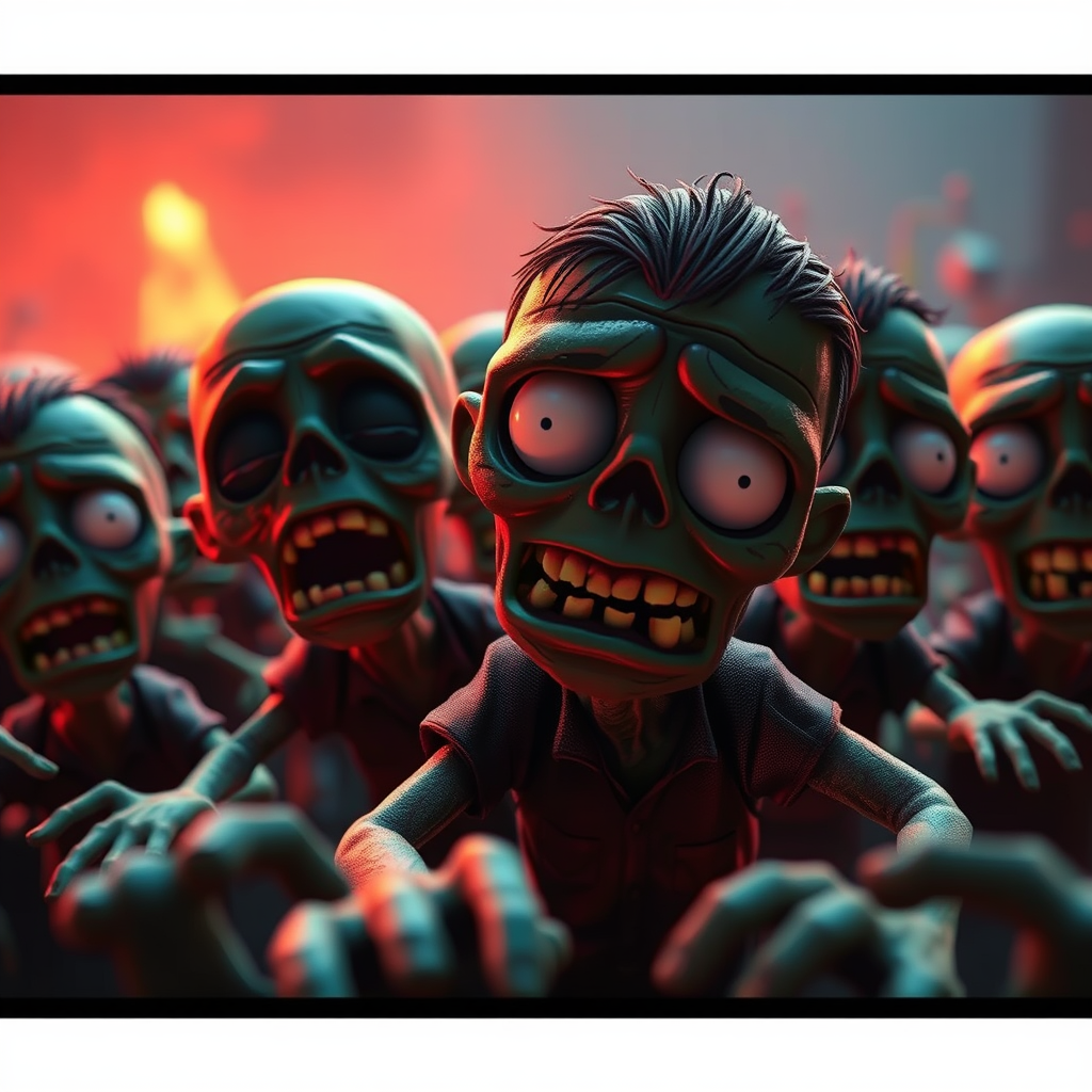 Screengrab from an animated film showing a horde of cartoonish zombies, rendered in 3D CGI with a horrifying yet playful twist, using a dark and moody color palette, enhanced by dramatic and cinematic lighting to create an eerie atmosphere.