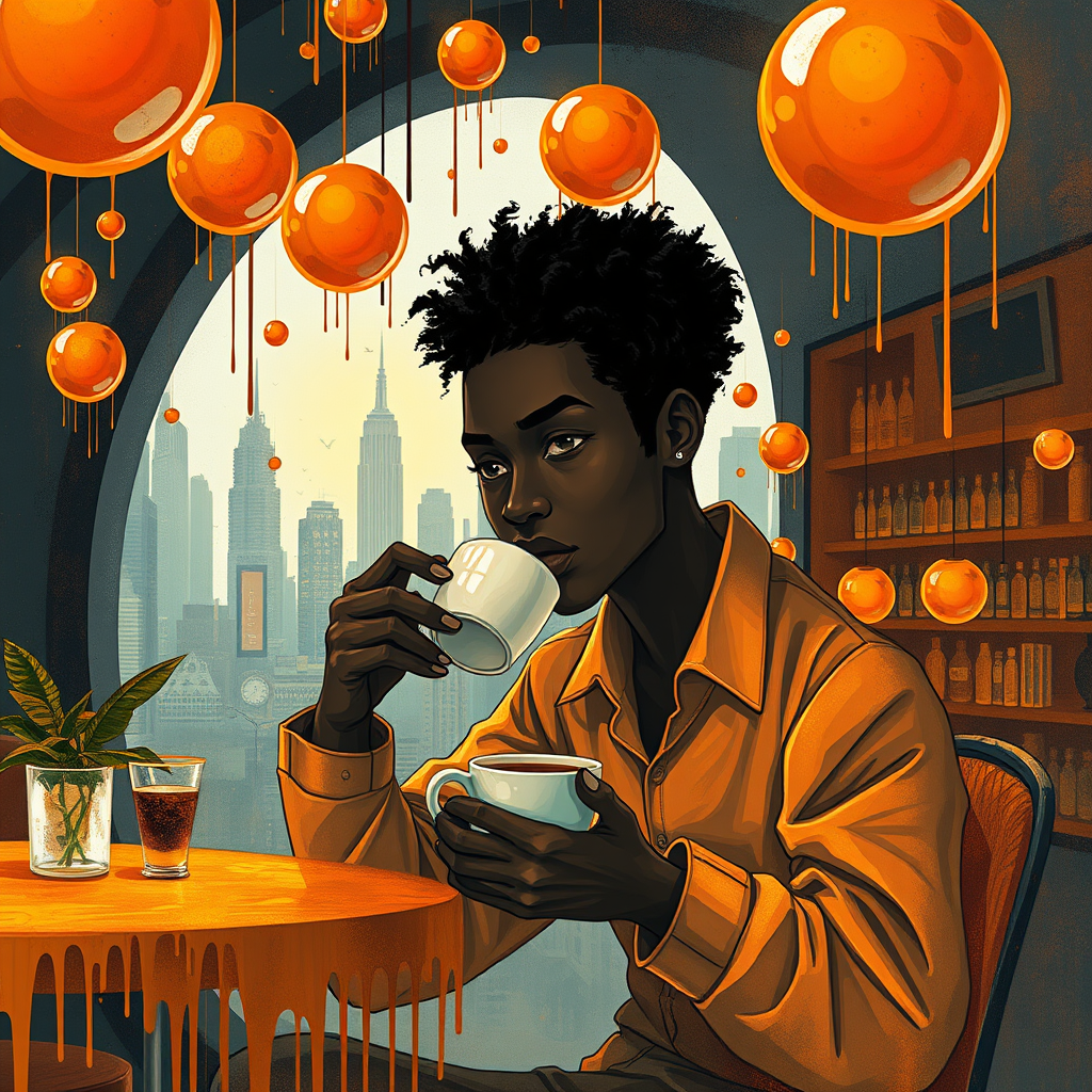 Screenshot three: a surreal illustration of a figure sipping coffee in an otherworldly café, bathed in dark amber and bright white hues. The scene employs a paint dripping technique, combining elements of afrofuturism and a futuristic cityscape. The figure is depicted with a realistic portraiture style, their eyes shimmering with stories untold. They are surrounded by floating orbs reflecting vibrant pop colors, adding a dynamic depth to the image. The composition is elongated, emphasizing an 8:11 ratio, with a sense of serenity and cosmic connection at a sensitivity of 750.