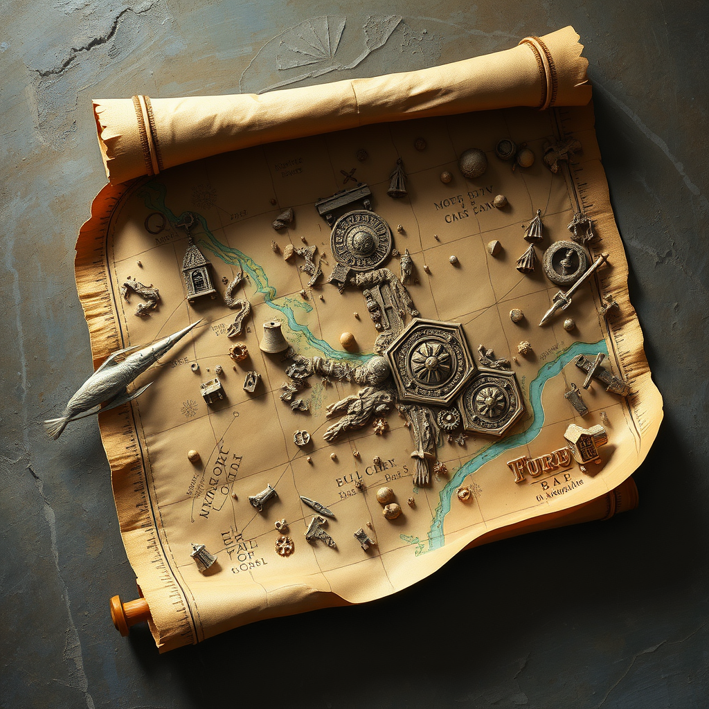 scroll map with embossed illustrations 5 raised relief features, pop-up elements, oil painting 3 detailed intricacies, volumetric lighting effects 2 --aspect ratio 3:2