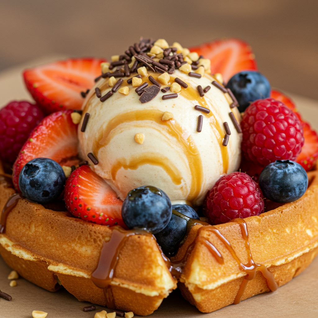 Scrumptious ice cream nestled in a half-moon waffle, adorned with an array of fresh berries and a sprinkle of delectable toppings.