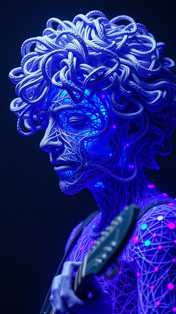 View this AI-generated image featuring a hyper realistic sculpture of a curly haired musician reminiscent of beeple s style radiating a vibrant true blue glow the figure is intricately detailed with complex patterns and networks woven throughout its form bright gray and electric purple hues interpla