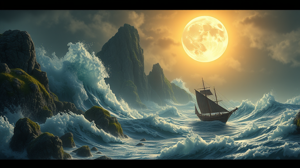 Sea breathtakingly intricate foamy waves, colossal moss-laden rocks, luminous full moon, Unreal Engine, richly detailed, digital painting, cinematic scope, character design inspired by Mark Ryden, Pixar, and Hayao Miyazaki, minuscule hyper-realistic sailing vessel with cinematic illumination, popular on ArtStation, 4k resolution, hyper-realistic focus with extreme detail, rendered in Unreal Engine 5, a cinematic masterpiece, Unreal 5, DAZ Studio, hyperrealism, captured with Canon 5D quality, Octane Render.