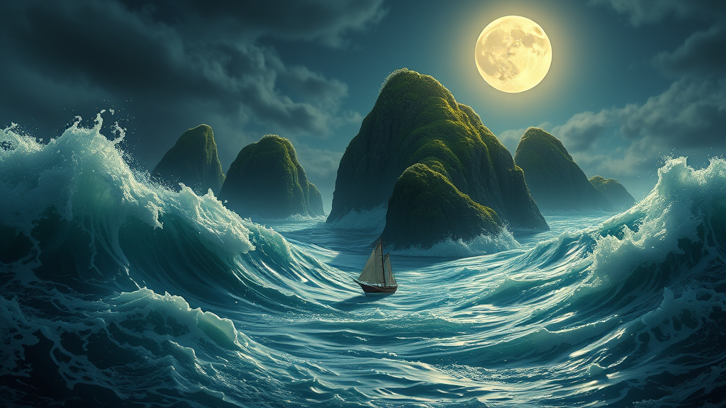 Sea shimmering with intricate foamy waves, colossal moss-covered rocks under a radiant full moon, crafted with the dream-like essence of Mark Ryden, Pixar, and Hayao Miyazaki. A minuscule, ultra-realistic sailing ship amidst this cinematic wonder, rendered in stunning detail with Unreal Engine 5. Envisioned as a digital painting, this masterpiece captures the essence of hyper-realism and focused artistry, generating a magical environment reminiscent of a Canon 5D shot enhanced by Octane Render. With trending ArtStation aesthetics, the scene combines extreme details with unparalleled cinematic lighting, portraying an extraordinary seascape that feels both fantastical and tangible.