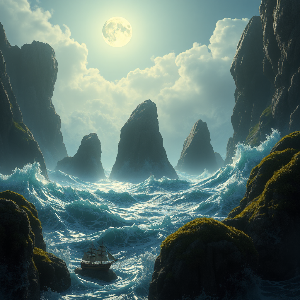Sea sparkling with intricate foamy waves, colossal moss-covered rocks, luminous full moon overhead, imagined through Unreal Engine 5, richly detailed digital painting with a cinematic touch, character design influenced by Mark Ryden, Pixar, and Hayao Miyazaki, featuring a tiny ultra-realistic sailing ship bathed in dramatic lighting, trending on ArtStation, 4k resolution, hyper-realistic with focused extreme details, a masterpiece conceived with Daz, shot on Canon 5D, rendered with Octane, evoking a sense of breathtaking imagination.