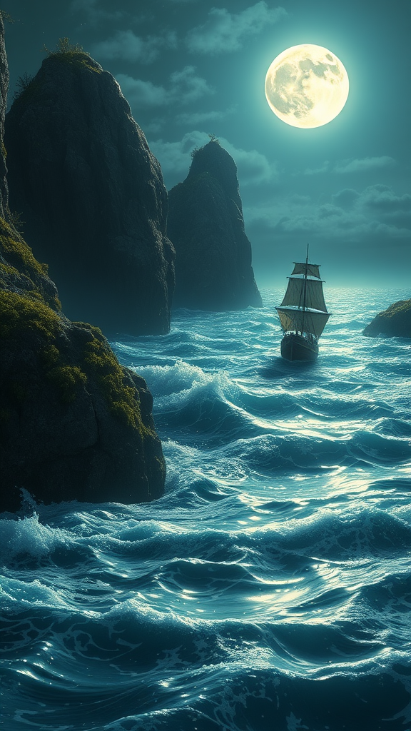 Sea sparkling with intricate foamy waves, majestic moss-covered boulders under a luminous full moon, created with unreal engine, featuring detailed digital painting style, cinematic artistry inspired by Mark Ryden, Pixar, and Hayao Miyazaki. A tiny, ultra-realistic sailing ship illuminated by cinematic lighting, trending on ArtStation, captured in hyper-realistic 4k with extreme attention to detail. Rendered in Unreal Engine 5, this cinematic masterpiece employs daz and sophisticated techniques reminiscent of a shot on a Canon 5D with octane render, conveying a breathtaking blend of realism and imagination.