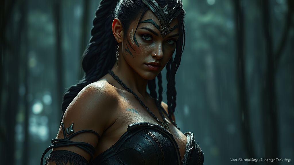 Seductive Amazon warrior in a highly detailed, handcrafted outfit, wearing war paint with an intimate and fierce facial expression. Set against the dark woods under pouring rain, the scene is enhanced by dramatic cinematic lighting. This concept art captures the essence of a battle-hardened fighter in a photorealistic style using Unreal Engine 5, RTX, and ray tracing technologies. The environment's mood is intensified by the interplay of light and shadows, creating a mesmerizing visual. The Amazon warrior stands with a missing arm, a subtle yet powerful symbol of resilience and strength, underscoring her warrior spirit despite her loss. A faint watermark adds an element of authenticity to this evocative image.