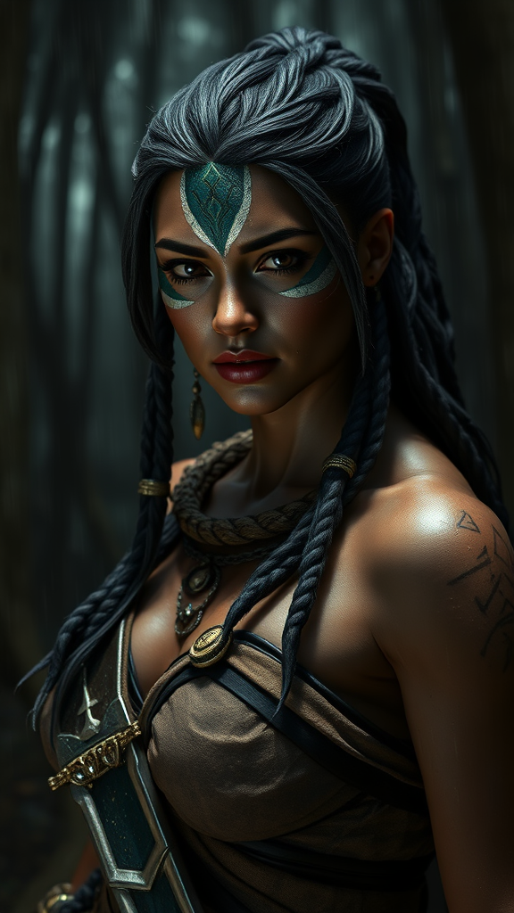 Seductive Amazon warrior with hyper-detailed features and an intimate facial expression, adorned in a handcrafted cloth outfit with war paint. Set against a backdrop of dark woods during a rainstorm, the scene features dramatic cinematic lighting. The concept art is created in Unreal Engine 5 using RTX for ray tracing, achieving a photorealistic effect. The image includes a subtle watermark. The warrior's imposing presence is emphasized despite the absence of arms and hands.