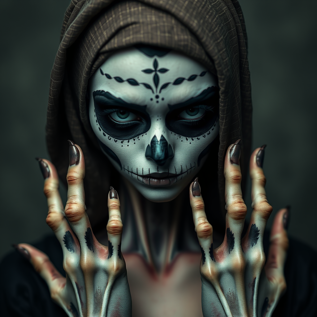 Seductive portrait of a mysterious figure with a head scarf, adorned with Día de los Muertos-inspired makeup, featuring gothic elements. The face appears duplicated and mutated, with crossed eyes and an elongated neck, alongside extra fingers and uniquely shaped hands. The overall image is a blend of surreal and abstract styles, showing hints of low resolution, slight blurriness, and digital artifacts. Cropped closely, it suggests a sense of being out of frame, with a touch of cartoon-like features and subtle distortions.