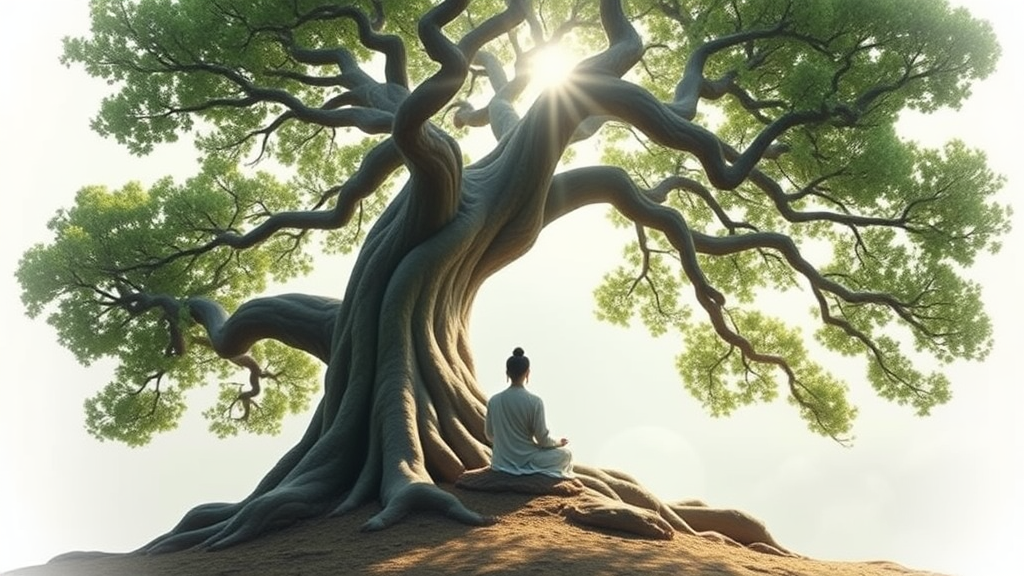 Seek tranquility as a serene figure under a sacred tree, embodying wisdom and enlightenment while radiating inner peace and compassion to all around.
