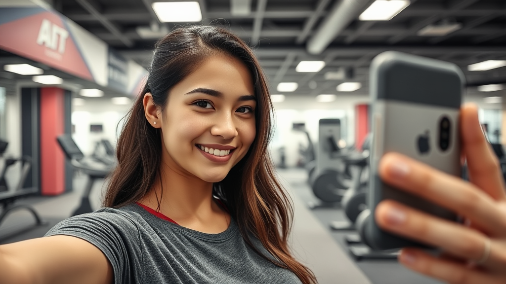 selfie of a young woman at a fitness center easynegative ng_deepnegative_v1_75t badhandv4, avoiding visible logos, brands, symbols, text