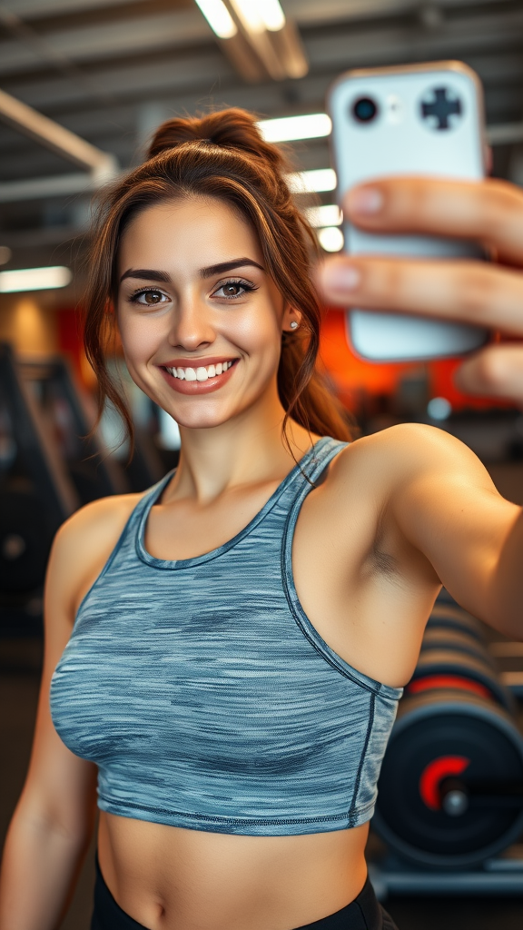 Selfie of a young woman in a gym, highlighting her workout attire, in a vibrant, energetic setting with blurred background equipment, lighting that enhances the positive vibe, minimal distractions, and no visible brands or text.