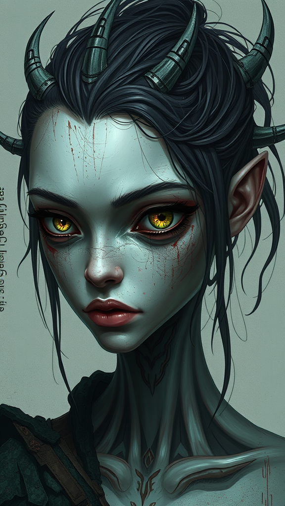 Senua-inspired character, digital art style, low resolution with varied eye colors, exhibiting signs of heterochromia, presented with intentionally degraded quality, visual imperfections like jpeg artifacts, elements falling out of frame, unintentional watermarks and signatures, abstract features with distorted and disfigured appearance, presence of unintentional text, anatomical inconsistencies such as extra limbs and fingers, facial features that appear poorly rendered, unnatural proportions, an image that is partially cropped leading to incomplete head depiction, irregular limb formation and fingers that appear fused together, giving an elongated neck a surreal touch.