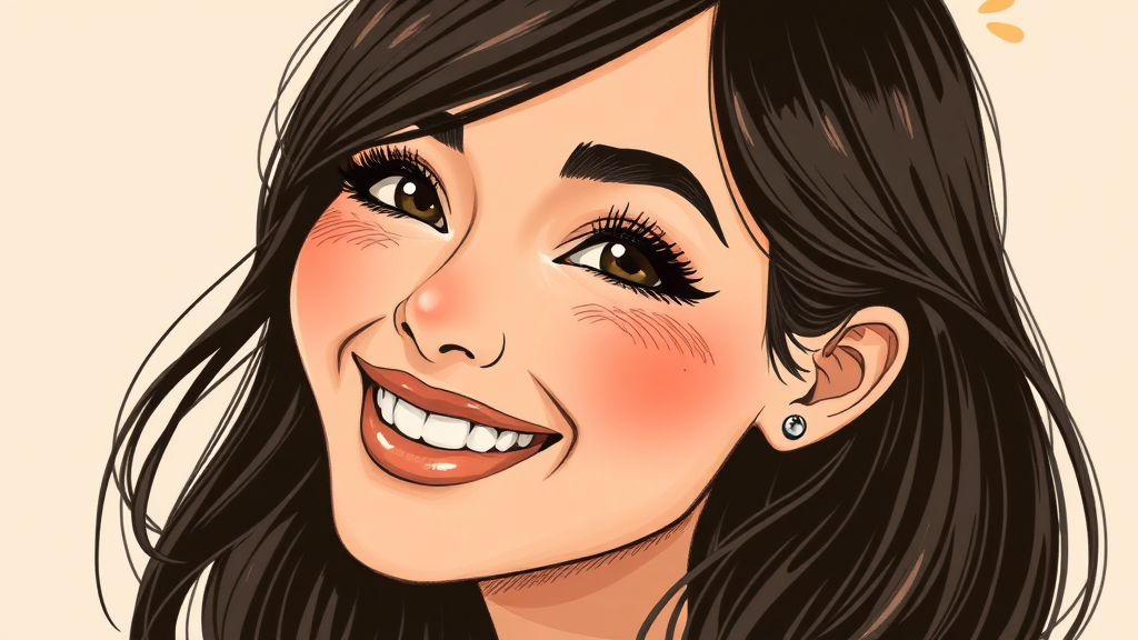 sepia illustration of a woman with black hair and beautiful radiant skin, smiling warmly; the artwork combines elements of 3D and traditional painting styles with a slight cartoonish touch; features are detailed with emphasis on her face, showcasing her expressive eyes and elegant smile; low-resolution sketch style adds an analog photograph vibe; includes unique elements like subtle pink highlights in hair and imaginative touches like soft, collapsed eyeshadow to create a whimsical appearance; overall, the image merges classic and quirky artistic elements into a cohesive, creative portrait.