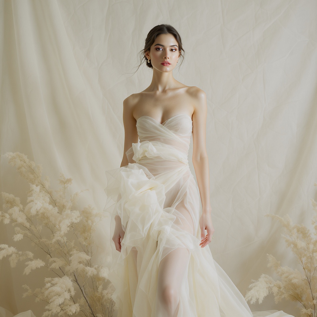 Serene and peaceful atmosphere; fashion photography inspired by Mario Testino; full body shot of a female model; elegantly designed dress with ultralight silhouettes; detailed focus on skin; captivating eyes; remarkable body composition; aspect ratio 4:6; incorporating a sense of randomness and high stylistic quality, enhanced with subtle creativity and refined sophistication.