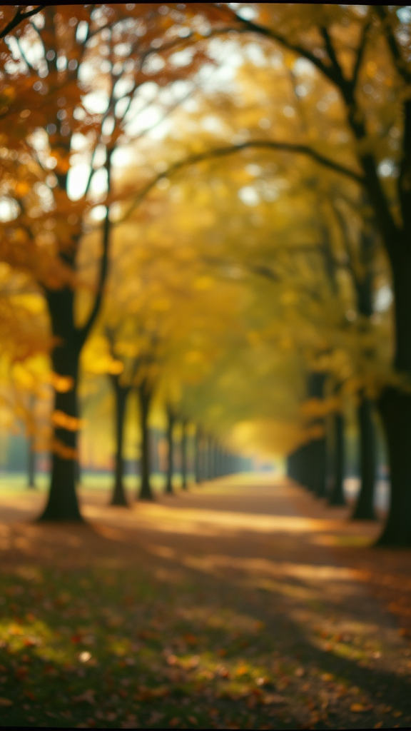Serene Autumn Park Scene, soft-focus bokeh, vintage Film Texture, 35mm Aesthetic, Kodak Portra Warmth, Subtle Lens Flare, Rich Autumnal Palette, Radiant Light Effects, --ar 4:5