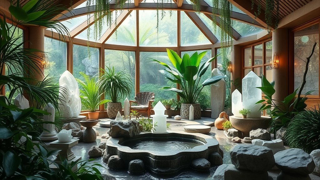 Serene meditation sanctuary featuring abundant crystals and lush indoor greenery, bathed in natural light and designed with a harmonious blend of organic materials, hyperrealistic and cinematic 8k ultra hd atmosphere, soft textures and soothing colors enhancing the peaceful ambiance, subtle water feature and gentle soundscapes complementing the tranquil setting.
