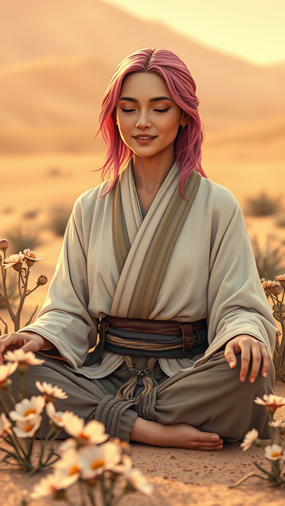 serene photo of a female Jedi master in deep meditation, smiling, wearing a detailed jedi outfit, sitting cross-legged among blooming desert flowers, embodying a harmonious connection with the Force, experiencing a spiritual retreat in transcendent tranquility, capturing desert enlightenment, high-resolution hdr illustration, with an extremely detailed and expressive face, displaying skin texture in a realistic manner, evocative RAW-photo style with subtle film grain, popular on deviantart as an illustration, combines elements of 3d art and sepia painting styles, features touches of cartoon and sketch aesthetics, emphasizes natural beauty and ethos without exaggerated or unrealistic features, showcasing unique pink hair reflecting a gentle analog feel.