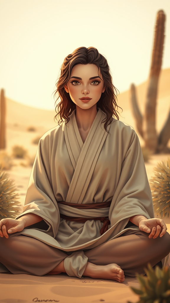 serene portrait, one woman, Jedi master in meditative focus, gentle smile, dressed in Jedi robes, seated cross-legged, surrounded by vibrant desert flora, attuned to the Force, spiritual oasis, ethereal calm, desert wisdom, high-resolution, hyper-detailed illustration, intricate facial features, RAW image, film texture, visible skin details, popular on deviantart, 3d rendering, sepia tones, painterly style, blend of cartoons and sketches, imperfections and unique features highlighted, natural hair, vintage photography influences.