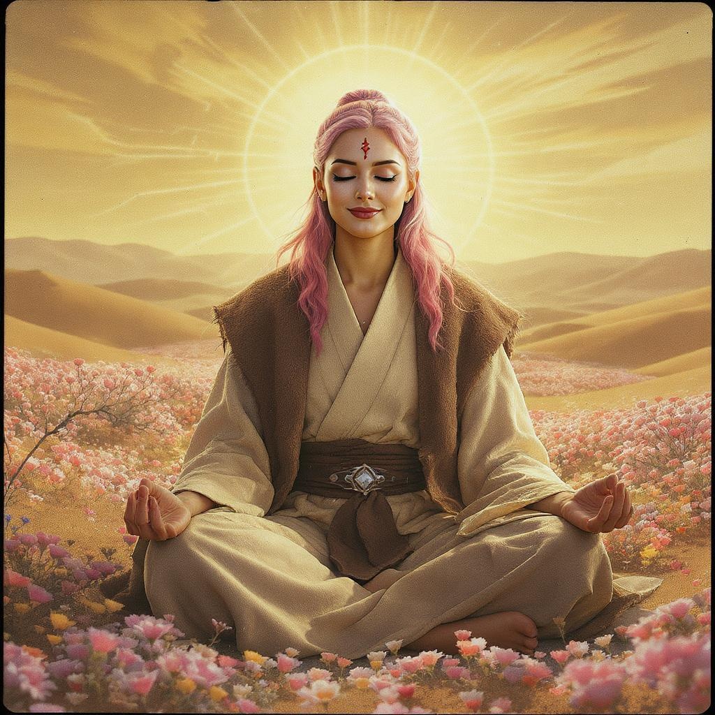 Serene portrait, single woman, Jedi Master in profound meditation, gentle smile, wearing traditional Jedi attire, sitting cross-legged, amidst a sea of blooming desert flowers, harmonizing with the Force, spiritual journey, transcendent calmness, desert enlightenment, high-resolution, HDR, ultra-detailed illustration, incredibly detailed face, RAW photograph, film texture, visible skin texture, trending illustration on DeviantArt, 3D effect, sepia tones, painted style, cartoonish sketch, imperfections in anatomy, low quality detail, unique interpretation, unconventional eye makeup, soft pink hair, analog photograph aesthetic.