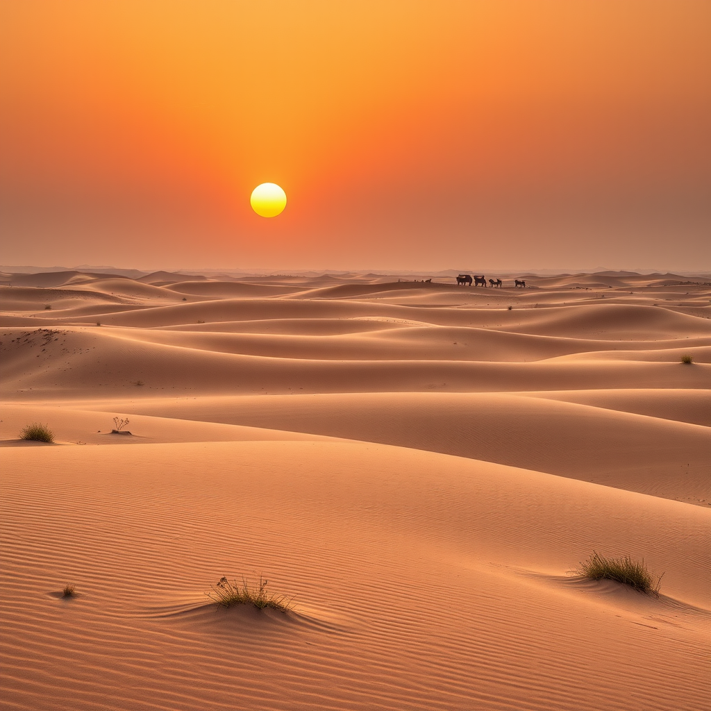 Serene Sahara landscape during twilight, 4k hyper-realism, inspired by Anton Gorlin, popular on artstation, crisp clarity, studio photography, exquisite intricacies, richly detailed, paying homage to Greg Rutkowski, gentle sand dunes under a soft, warm glow, scattered resilient vegetation casting delicate shadows, a distant caravan meandering along the horizon.