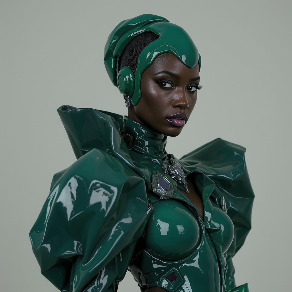 Serious black female model gazes diagonally, adorned in avant-garde and futuristic attire, crafted from innovative plastic and latex materials, featuring abstract forms and asymmetric techno embellishments, dominated by shades of emerald green, captured in 4k resolution. A medium shot in cinematic photography style, inspired by the essence of Iris van Herpen.