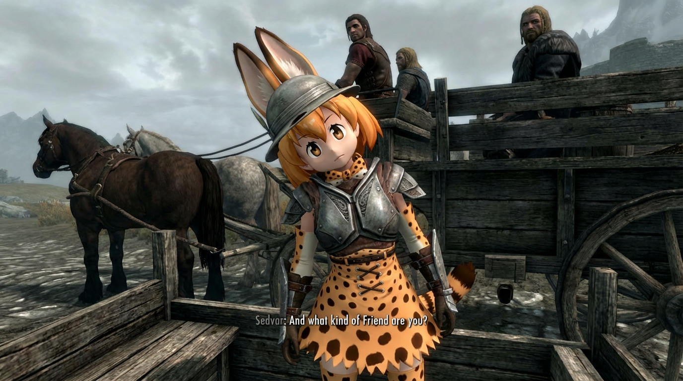 Here is Serval from Kemono Friends (image 1) On image 2 - a scene from the start of skyrim, where Hadvar (on the right) asks player "Who are you?" A photorealistic screenshot from the beginning of Skyrim, but with a surreal twist. In place of the Imperial soldier Hadvar, Serval from Kemono Friends stands. She wears mismatched Imperial armor pieces awkwardly strapped over her usual outfit, with her orange hair, cat ears, and tail fully visible. She looks at the player character (first-person POV) with a serious but slightly confused expression, her head tilted. Subtitles says "Sedvar: And what kind of Friend are you?" Her model looks 3d, like it is a normal 3d skyrim character model.