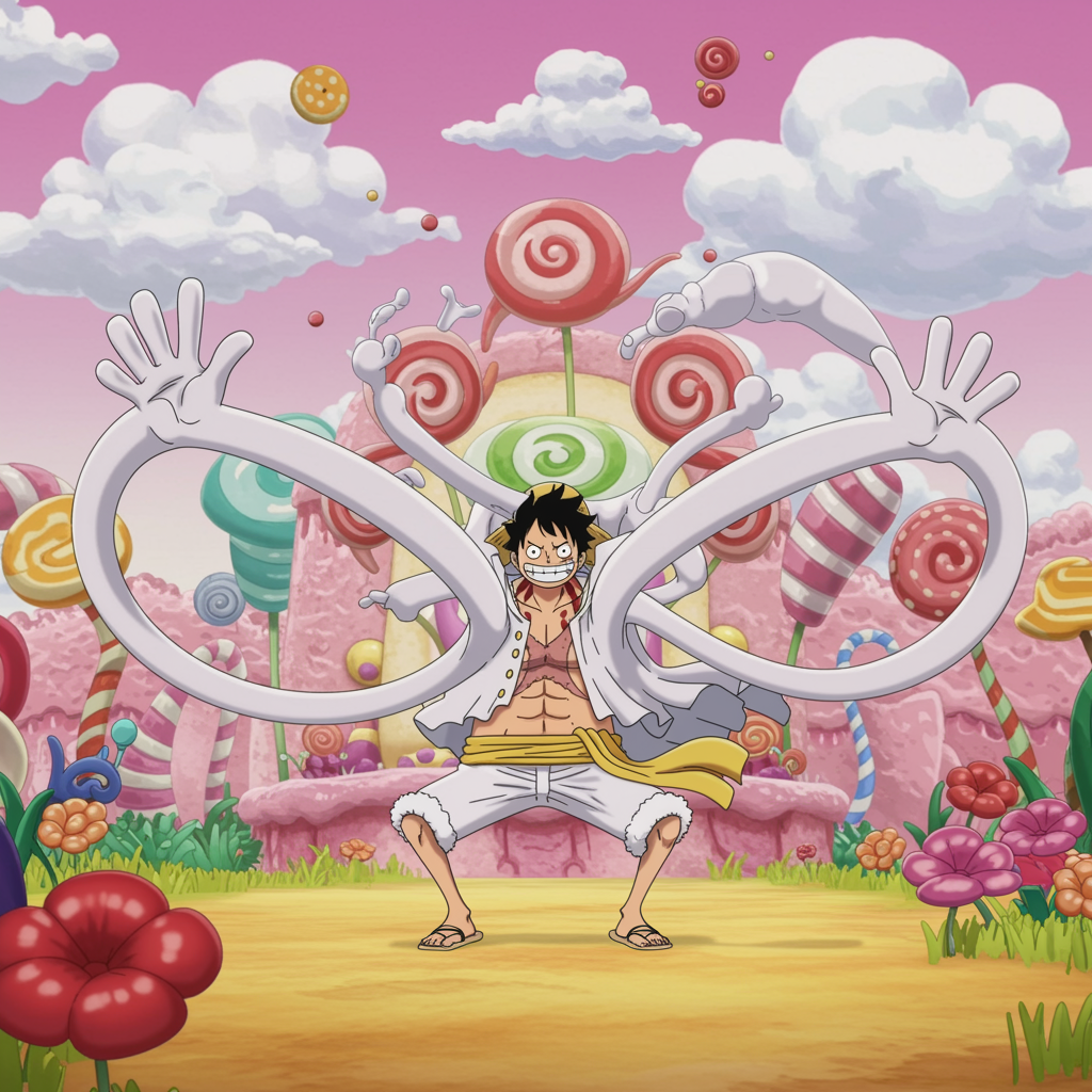 In a vibrant and imaginative setting filled with swirling candy-colored clouds and playful, animated flora, Luffy from One Piece stands at the center, embodying his Gear 5 transformation as the legendary God Nika. His pristine white form shines brilliantly, exuding a divine yet humorous aura. His exaggerated rubbery limbs stretch and bounce with whimsical elasticity, creating comically surreal shapes and patterns in the air. With a mischievous grin, Luffy interacts with the environment, using his powers to morph the whimsical world around him into a living cartoon spectacle. The scene is rendered with stunning detail and dynamic motion, highlighting his playful spirit and boundless creativity, while small imaginative tweaks breathe fresh life into his legendary form, making it an unforgettable, side-splitting masterpiece.