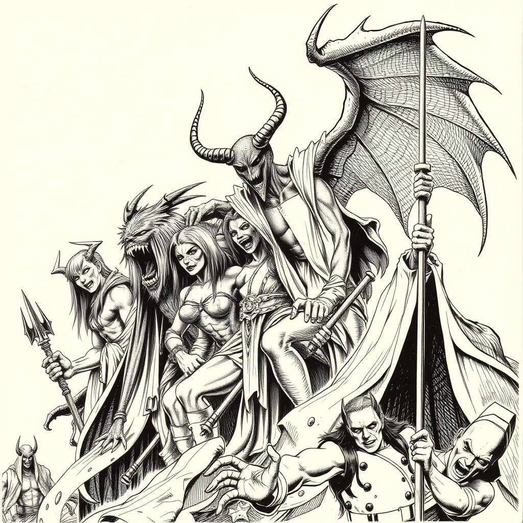 Seven Sinful Forces, inked illustration in monochromatic sepia hues, rendered in a comic book aesthetic, set in a contemporary timeframe. The piece makes extensive use of hatching and cross-hatching to create texture, with dynamic shading techniques employed to enhance depth and form. Subtle alterations add a unique twist to the classic theme, infusing it with fresh perspective while maintaining its essential essence.