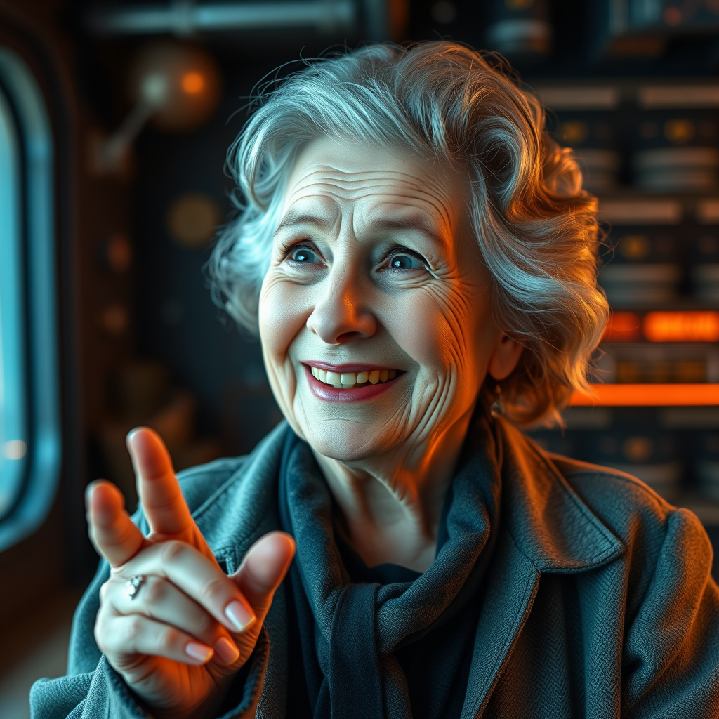 Seventy-year-old woman with a soft, round build, exuding a warm and cheeky smile, inspired by the artistic styles of Mark Citret, Guillermo Espinosa, Carl Frederik von Breda, Ed Benedict, Sebastian Errazuriz, and Colin Campbell Cooper. Set in a steampunk aesthetic with expertly utilized negative space and subtle color grading, this cinematic film still captures an analog essence in a hyper-realistic UHD format, complete with 8k resolution and soft lighting. The image is taken with a Fujifilm XT3 and an Olympus XA2 Camera using an 85mm lens at F/2.8, employing HDR to enhance detail, and featuring volumetric lighting and fog for depth. This fashion shot boasts absurd resolution with surreal colors inspired by the Thomson MO5 palette and the principles of Modular Constructivism. Captured with a realistic touch, showcasing a pretty hand and cinematic composition ideal for editorial cover art, the shot avoids common artistic pitfalls like distortion, duplication, or errors in anatomy, delivering a perfect balance.