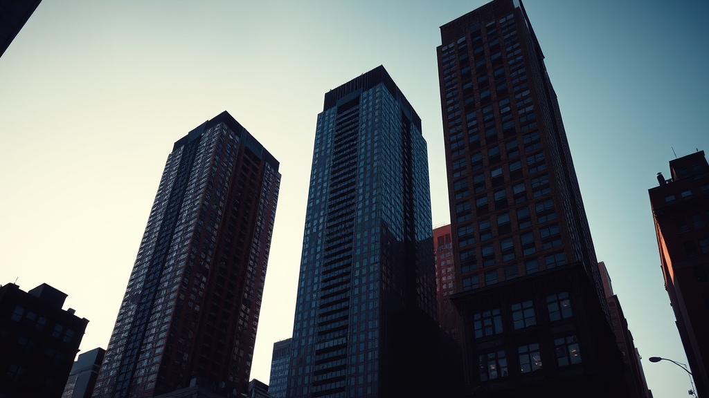 Several towering buildings dominate a shadowy sky, captured with striking perspective angles reminiscent of the American Barbizon School. The scene is imbued with hues of gentle maroon blending into sky-blue, evoking a sense of raw street photography. The atmosphere carries the artistic essence of Asher Brown Durand, depicted in ultra-high-definition detail. The composition embodies a unique urban aesthetic, akin to Yankeecore, with sharp contrasts and soft transitions.